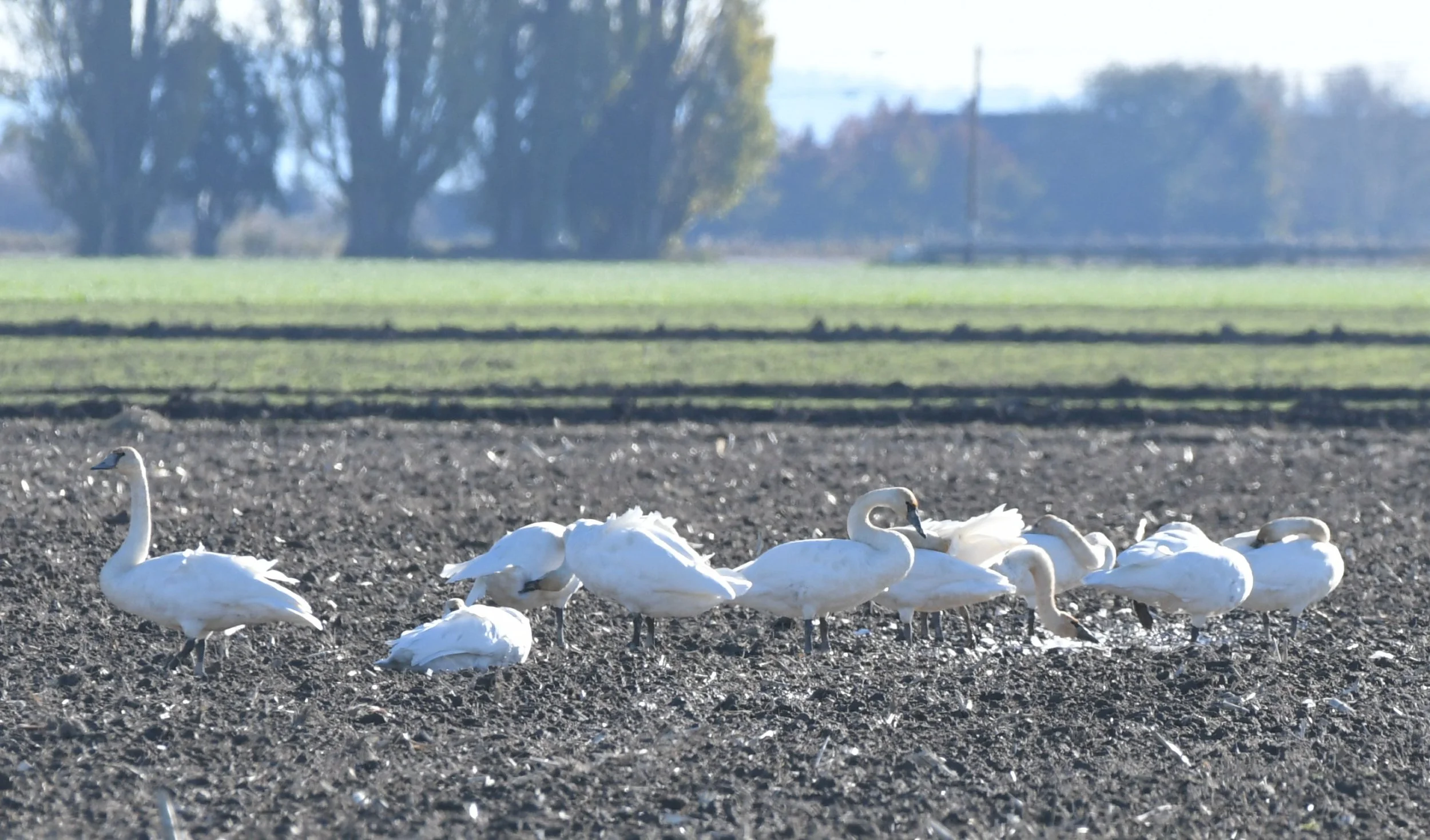 If we didn’t have all this farmland, the swans wouldn’t be here in these numbers (~15,000 each winter). It’s the corn, other grains, and potato leftovers in the fields that attract them. The unharvested potato fields in the area are full of swans in the winter. We might have swans next to our farm for weeks, just foraging.