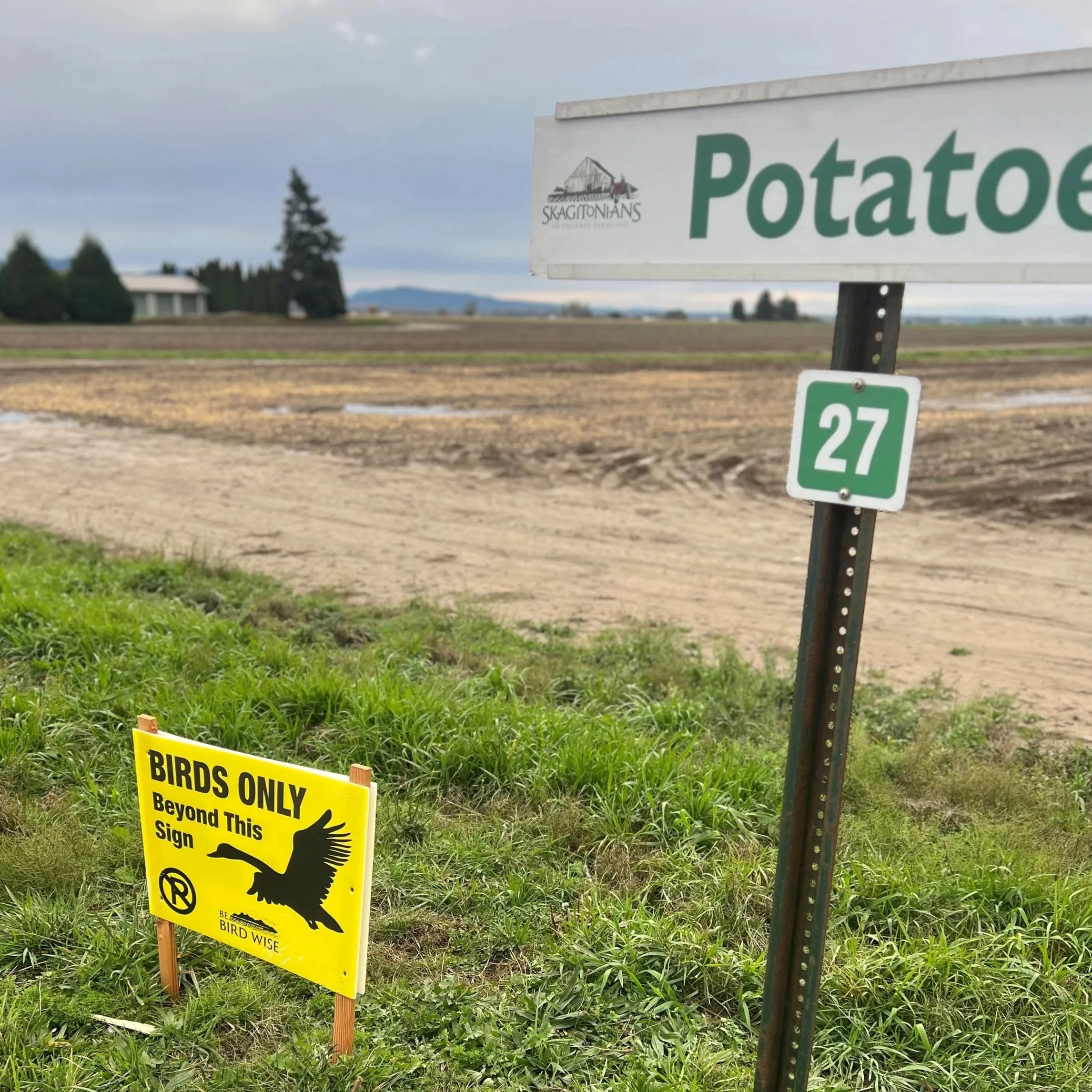 We still have potatoes and several other waterfowl-friendly crops in Skagit. A friend and I were watching swans gathered in a field full of cull potatoes. People in cars, and even a pair of cyclists, stopped for the swans and potatoes. A couple of people walked into the field to grab what they saw as free food. They trespassed onto private property, disturbed the swans, and intended to glean potatoes covered in swan excrement! Multiple offenses, though they disregarded us when we commented they were trespassing. A Be Bird Wise sign along the road at that field would have been a good deterrent. As an educational tool, the signs come in handy on the side of the road when there are birds in a field and people stopping.