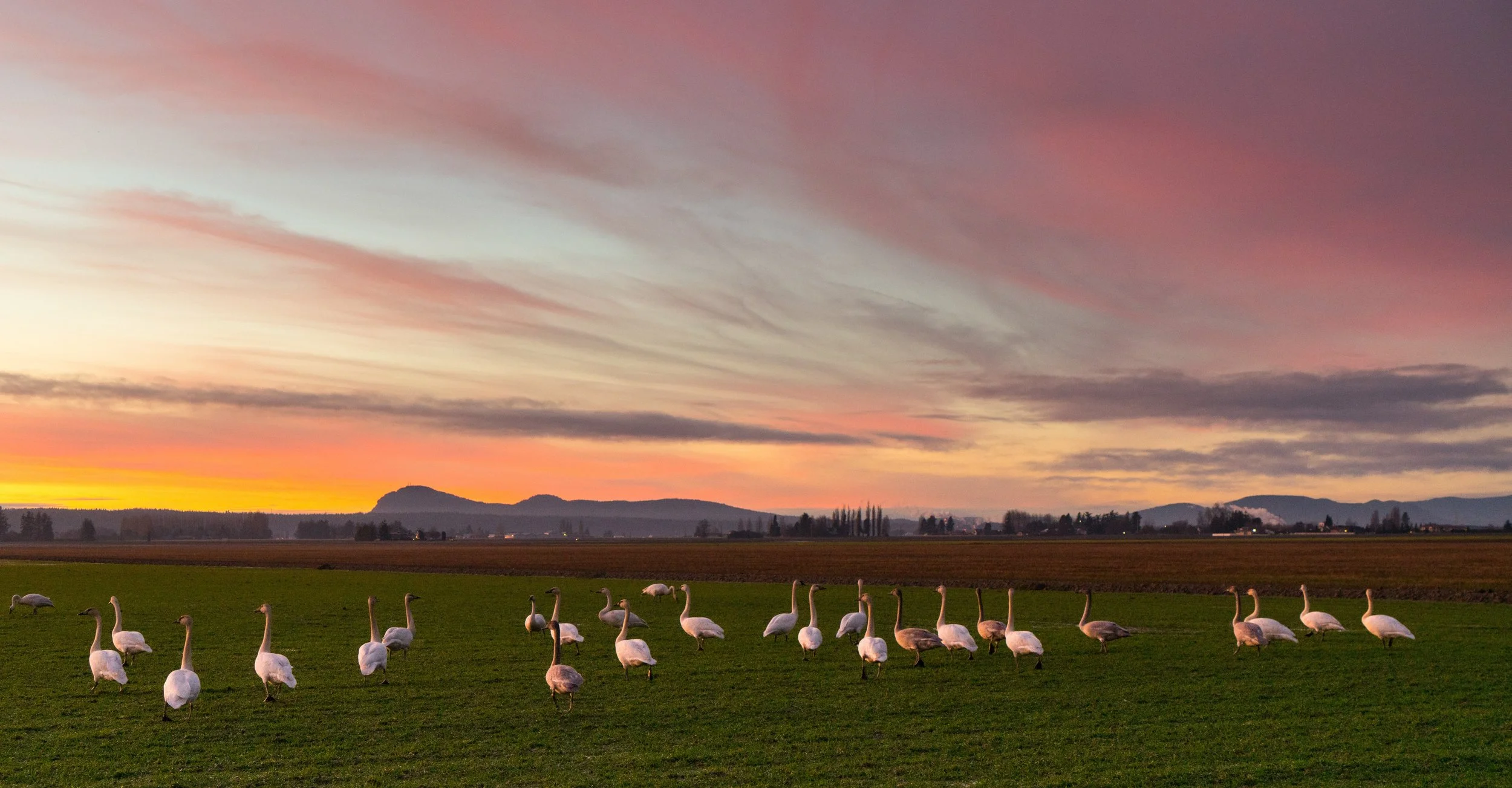 The Trumpeter swans in Skagit Valley are the Pacific Coast population, migrating to the Skagit Valley from Alaska and British Columbia. Swans have fidelity to their wintering grounds. They are in the Skagit Valley because of waterfowl-friendly agriculture, and adjacent ponds and wetlands for night roosting.